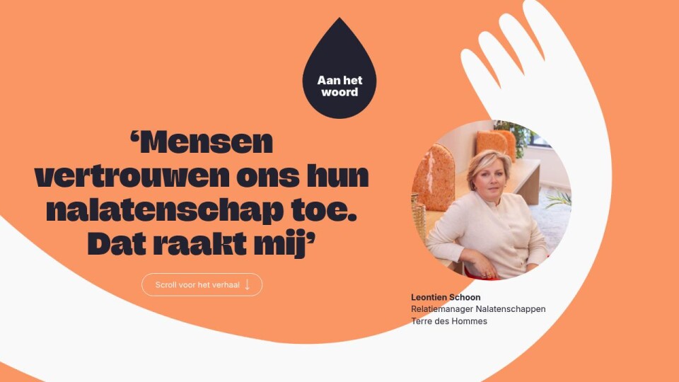‘Een oud-lerares die Terre des Hommes een warm hart toedraagt zei: ‘Mijn ouders waren van eenvoudige komaf en zij vonden het heel belangrijk dat ik alle kansen kreeg om mijzelf te ontwikkelen. We gingen naar musea, ik kreeg muziekles en een goede opleiding. Ik wil die kansen doorgeven.’ Zij koos voor Terre des Hommes omdat zij kinderen toegang wil geven tot onderwijs. Een belangrijke manier om de armoedecirkel te doorbreken. Dat mensen ons hun nalatenschap - of een deel daarvan - toevertrouwen, raakt mij. Het is een van de meest bijzondere vormen van geven; het is een geschenk dat blijft doorwerken in de levens van kinderen wereldwijd.’