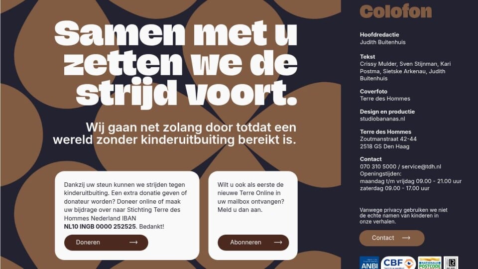 Dankzij uw steun kunnen we strijden tegen kinderuitbuiting. Een extra donatie geven of donateur worden? Doneer online of maak uw bijdrage over naar Stichting Terre des Hommes Nederland IBAN
