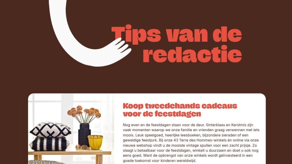 Nog even en de feestdagen staan voor de deur. Sinterklaas en Kerstmis zijn vaak momenten waarop we onze familie en vrienden graag verwennen met iets moois. Leuk speelgoed, heerlijke leesboeken, bijzondere sieraden of een geweldige feestjurk. Bij onze 43 Terre des Hommes-winkels én online via onze nieuwe webshop vindt u de mooiste vintage spullen voor een zacht prijsje. Zo slaagt u betaalbaar voor de feestdagen, winkelt u duurzaam en doet u ook nog eens goed. Want de opbrengst van onze winkels wordt geïnvesteerd in een goede toekomst voor kinderen wereldwijd.